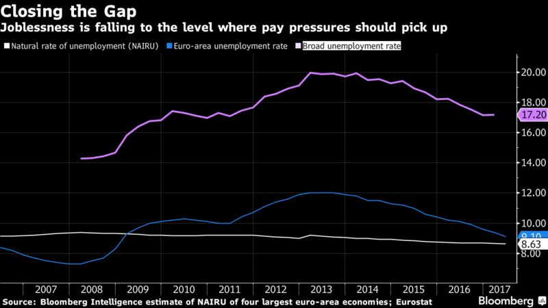 The key missing element might be wages, which are barely rising despite the relatively rapid decline in unemployment over the past four years. One possible explanation is that the standard measure is underestimating joblessness. The ECB has developed a broader measure including those who work less than they want, and it’s almost double the official rate.