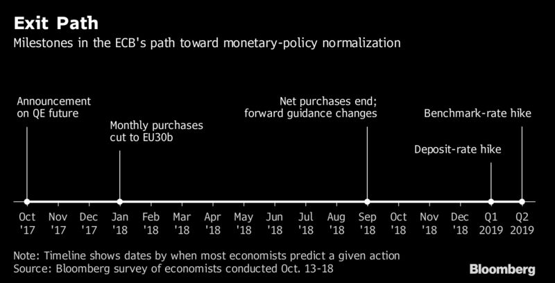 Economists don’t expect any change to the forward guidance that interest rates will remain unchanged until “well past” the end of net asset purchases. They foresee a rate hike, which would be the first under Draghi’s presidency, only in the first half of 2019 at the earliest.